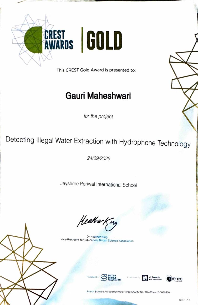 Crest Gold Award for the research project to detect illegal water extraction with Hydrophone technology