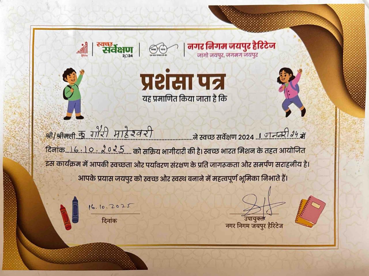 Was awarded by Mayor of Jaipur for my exceptional work as Brand Ambassador of Jaipur Municipal Corporation